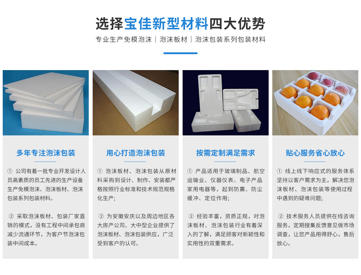 懷寧縣寶佳新型材料有限公司是泡沫包裝專業生產商,公司致力于產品內包裝的設計和生產為客戶解決產品的防震緩沖、定位和保溫等包裝問題本公司有著一批開發設計人員高素質的...